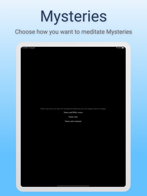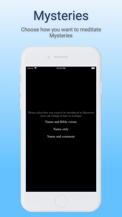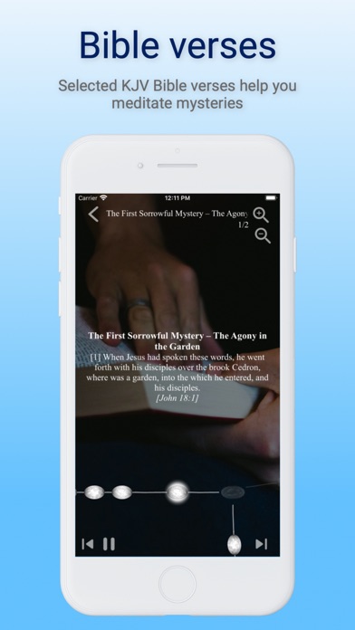 You may select how mysteries are introduced: just mystery or followed by comment or selected King James Version (KJV) Bible verses that are read out loud with each decade.