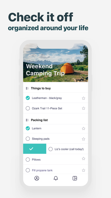 Going camping? Create a list and collaborate with friends to plan for where you’re going, the things you need, and who’s going to bring what.