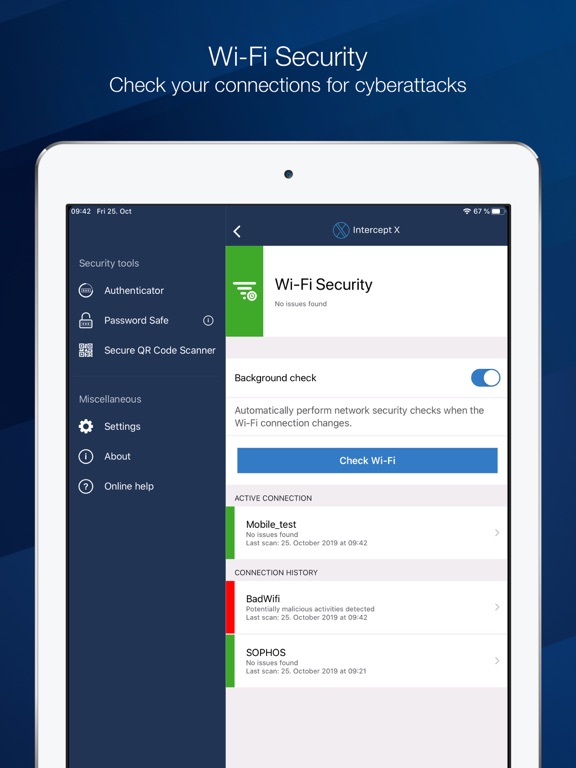 Sophos Intercept X for Mobile helps you to work safely on your iPhone or iPad. Security functionality includes highlighting important operating system updates and detecting malicious Wi-Fi connections. Furthermore, it provides a secure QR code scanner to read URLs, a password safe, and the ability to generate verification codes for multi-factor authentication (for example Google 2-Step Verification).