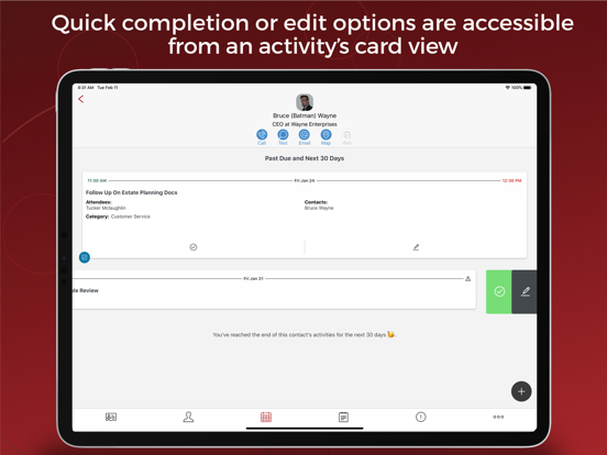 Expand your activities to a card view on the today page to view relevant details. Quick completion or edit options are accessible from an activity’s card view (or with a left swipe on a non-expanded card).