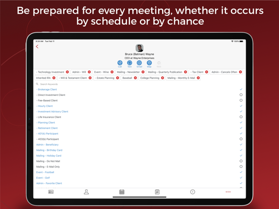 Quickly access your contacts’ activities, notes, accounts, contact card and details, important information, keywords and tag groups. Be prepared for every meeting, whether it occurs by schedule or by chance.
