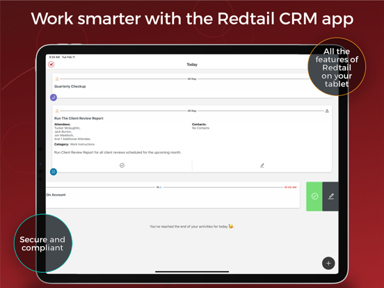 Using the Redtail CRM app, you can stay on top of meetings and opportunities and stay connected to your clients, your prospects and your team: