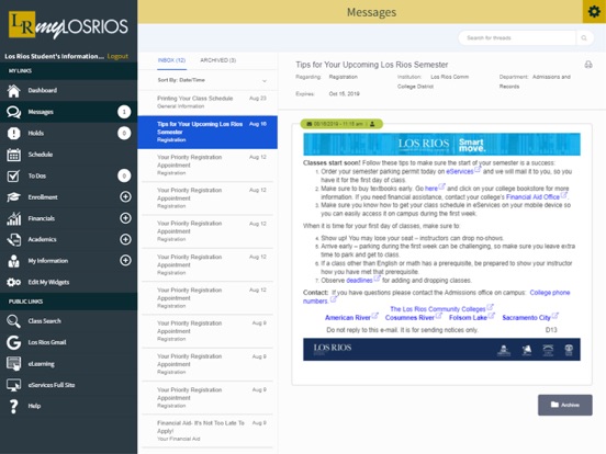 The myLosRios mobile app provides you easy access to take care of your college business (at ARC, CRC, FLC and SCC) from your mobile device or smartphone: