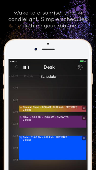 SCHEDULES TO ENHANCE YOUR DAILY ROUTINE: Schedule exactly the right light for the right time. Let your light energize you in the morning and help relax you at night, and more.