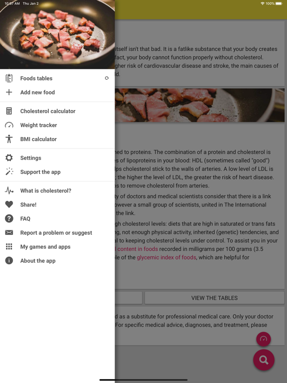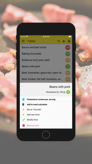 There are several factors that may cause high cholesterol levels: diets that are high in saturated or trans fats and salt, being overweight or obese, smoking, not enough physical activity, inherited (genetic) tendencies, and old age. Eating a heart-friendly diet is critical to keeping cholesterol levels under control. To assist you in your diet, this app contains a table of cholesterol content. In our other app you can find a table of the glycemic index of foods. Both apps are the good way to keep control over what you eat.