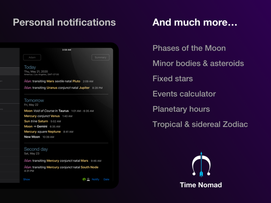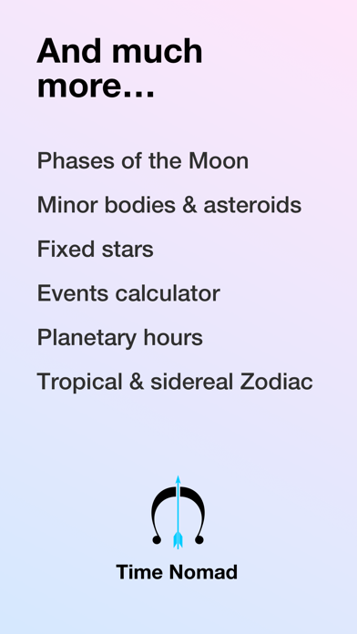 Time Nomad calculates your astrological transits, phases of the Sun and the Moon, movement of planets through the Zodiac.