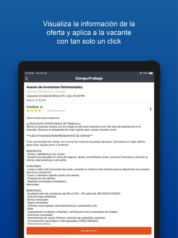 En la aplicación se visualizan todos los detalles de la oferta de trabajo: salario, requerimientos, educación mínima, entre otras informaciones.