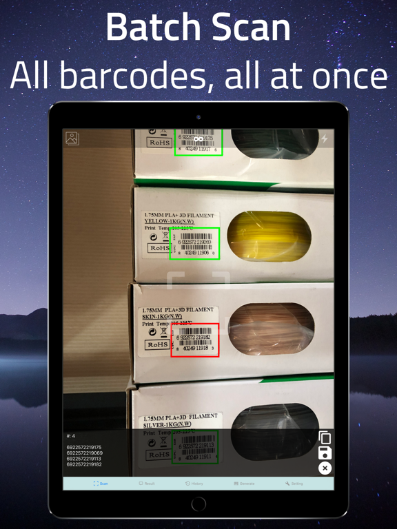 Very easy to use Barcode App. Supports QRCode, PDF417, ISBN and many more. Now with batch barcode scanning and "Barcode Generator" features.