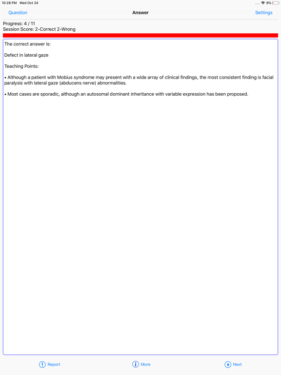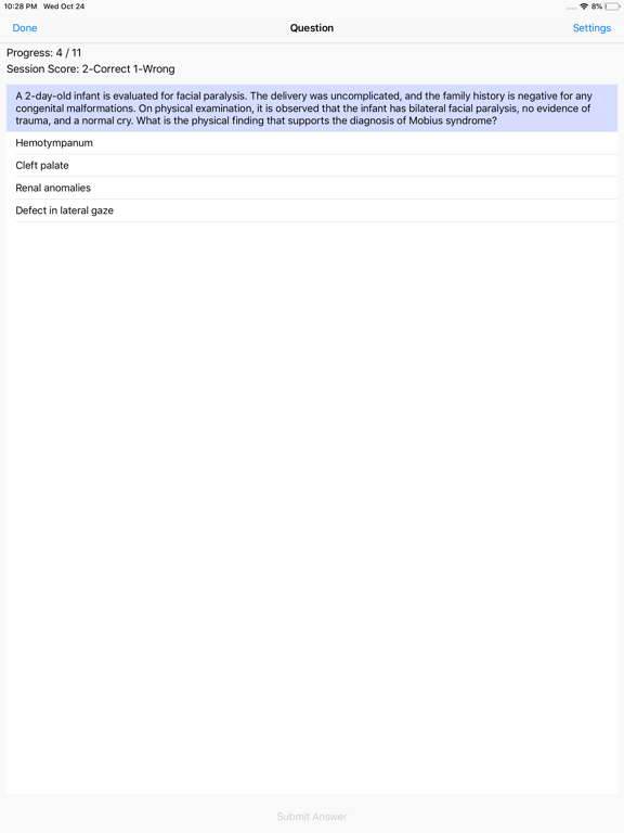 The app offers 10 multiple-choice questions with additional questions available for a small fee Explanations are linked to additional online references and can be accessed via the explanation page. Statistics are generated and include a list of keyword topics missed. These keyword topics will enable you to determine what areas need further study. Repeat all questions as many times as you wish.