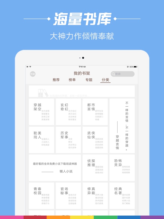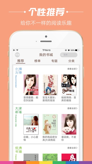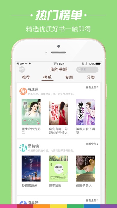 它们是网络小说的创作巅峰,它们长期横扫各大排行榜单之上,打破一个个数据神话,以实力证明能力。经百万读者鉴定,它们值得肯定。在这里,让好书遇见你。 精选百万图书资源,最新最热最全网络小说一网打尽;权威排行,超全分类,精选专题,没有找不到的,只有想不到的;超全搜索榜单,全网小说一触即达。 简单易用,改进了传统小说阅读器中的多种细节,对于每一个细节,我们都力求最易用,给您完美的用户体验。 更多精彩,尽在APP当中,快来下载体验吧!