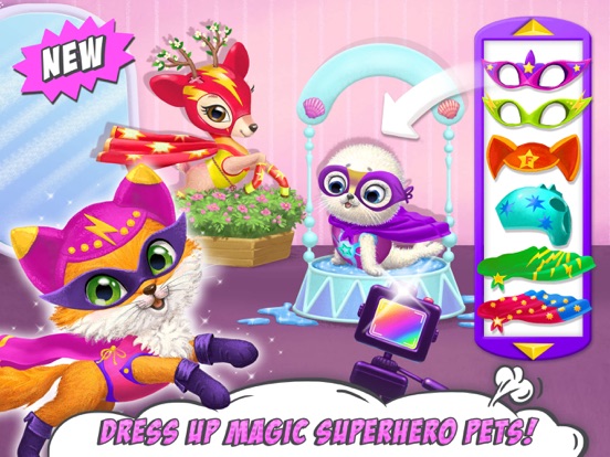 NEW! The magic superhero pets want to look fabulous too! Dress up cute fox Sparky, deer Daisy and seal Misty in the coolest superhero outfits!