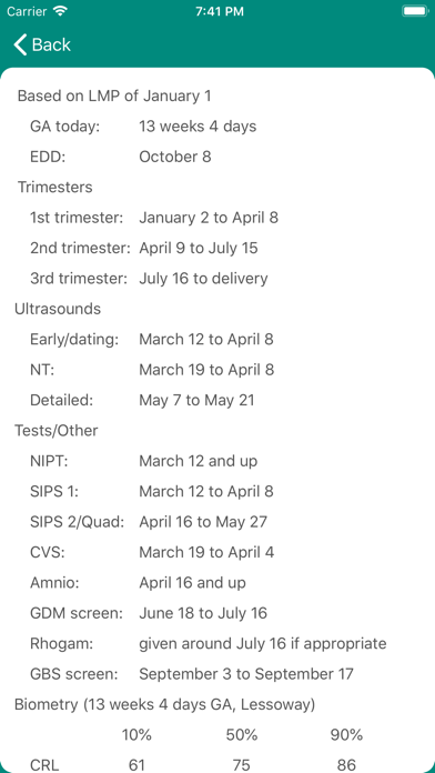 Prefer to enter dates manually? No problem. Select "Set" and choose dates by LMP, EDD, or GA on a specific date. Use the "Info" screen to see important dates (trimesters, testing and windows) and information on fetal biometry reference ranges (Lessoway) based on current gestational age.