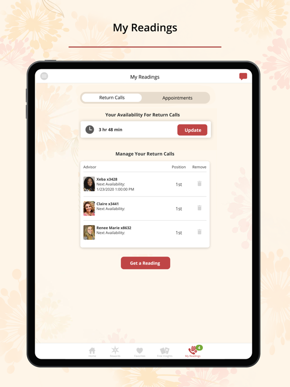 In addition to notifications, the app makes it quick and easy for you to manage your availability to receive return calls, appointment reminders, and manage and view your favorite advisors’ current availability for phone, chat and video readings. It also makes it easier than ever to join membership rewards right from the app and if you are already a member, you can check your progress.