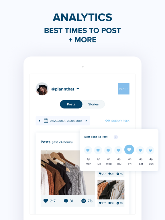 - Gain insights with Instagram analytics for best performing posts, likes, follower growth and locations.