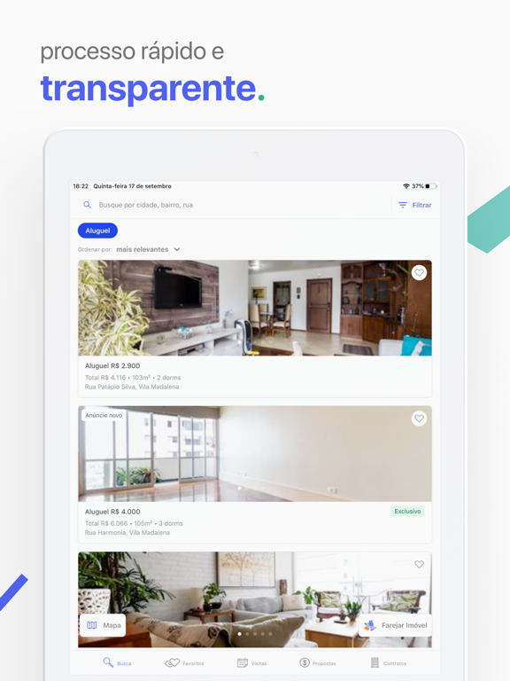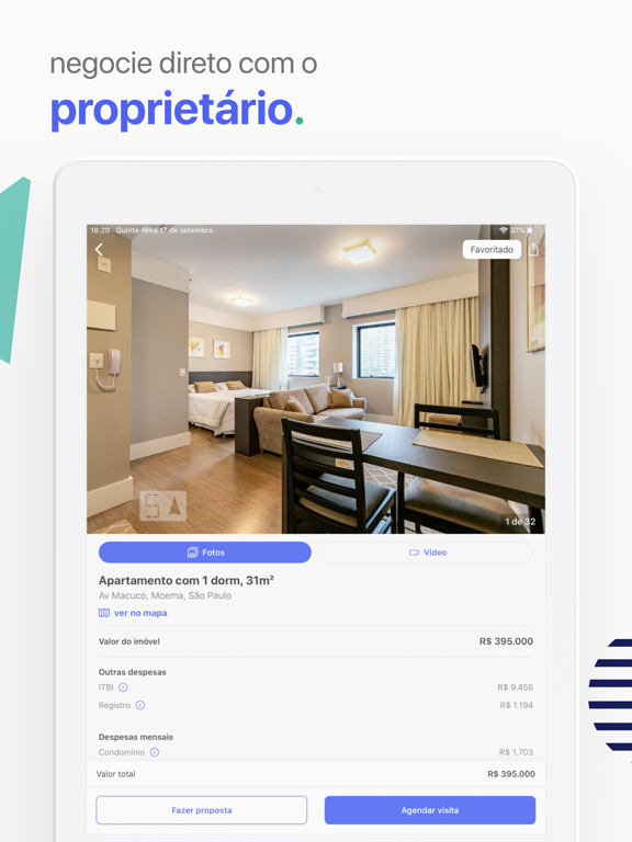 FAÇA SUA PROPOSTA DIRETO PELO APP! Você nem precisa esperar a visita terminar pra enviar a proposta de aluguel - ela acontece em poucos cliques! A negociação é diretamente com o proprietário. Quem quer comprar tem ajuda dos nossos consultores para negociar valores.