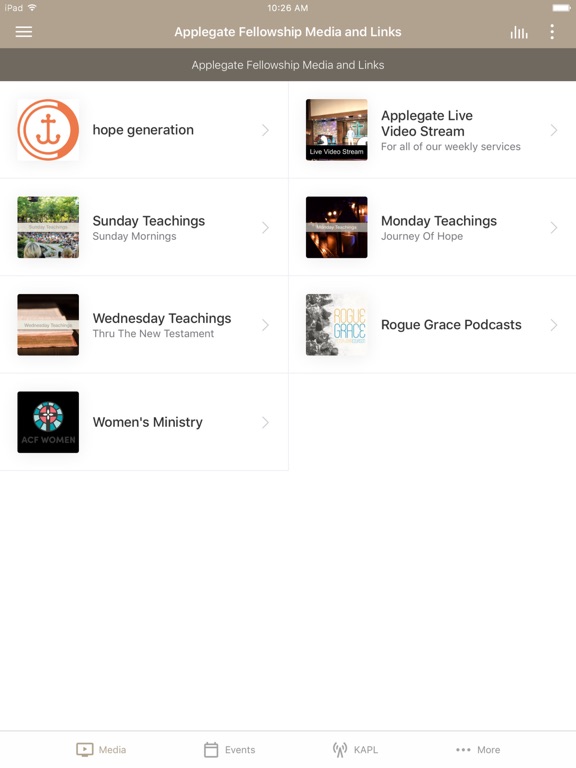 The Applegate Christian Fellowship App was created with the Subsplash App Platform.
