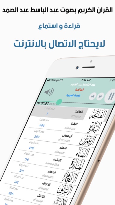 تطبيق القران الكريم يتلوه الإمام  الشيخ عبد الباسط عبد الصمد وبدون الاتصال بالانترنت يتميز هذا التطبيق بصوت رائع و شجي من الشيخ عبد الباسط عبد الصمد و بنسخة نقية وبدون الحاجة للاتصال بالانترنت يعمل هذا التطبيق حتى لو كان الجهاز مقفلا , قد ارتاينا في التطبيق استعمال سيرفرات عالية الجودة والحماية لكي يتم استعمال وتحميل البرنامج بشكل سريع وبدون اي مشاكل.