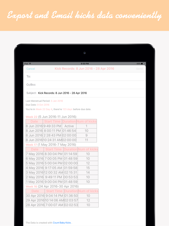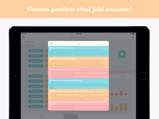 Tracking baby kicks is as easy as a tap if using this app, tap the button to record that fetal movement, it will keep baby kick’s time, duration with last kick, note: twist, turn and roll for example.