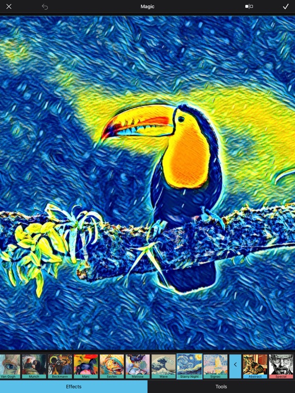 Dozens of photo filters are waiting for you to try them out. BeCasso offers styles of famous artists such as Picasso, van Gogh or Munch. A toolbox full of artistic filters, including oil, watercolor, cartoon, pencil drawing, and pop art, opens up endless possibilities for you to realize your vision of the perfect piece of art.