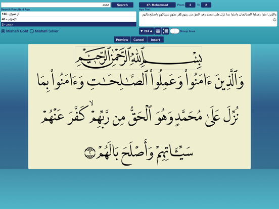 - NEW! Insert Quranic text using Mishafi Gold or Silver with search capability (full Quran available as In-App Purchase).