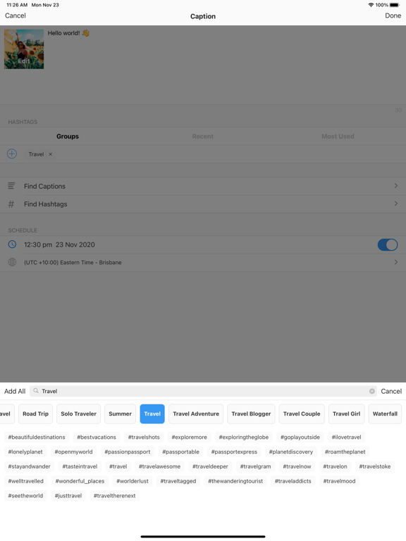 Write your captions in advance and perfect them. Save your hashtag groups within the app and add them to new posts at a press of a button.