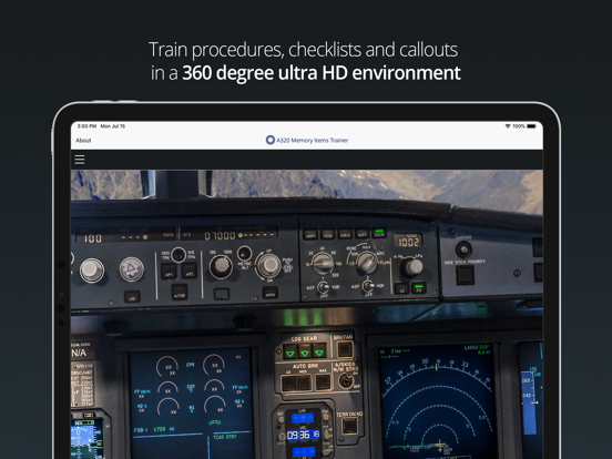The Airbus A320 Memory Items Trainer lets you learn, practice and test procedures in immersive 360° UHD cockpit from your iPad or iPhone. Prepare for type rating, simulator or flight training, anytime, anywhere.