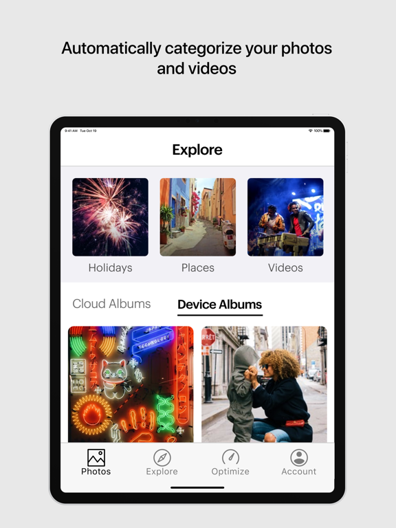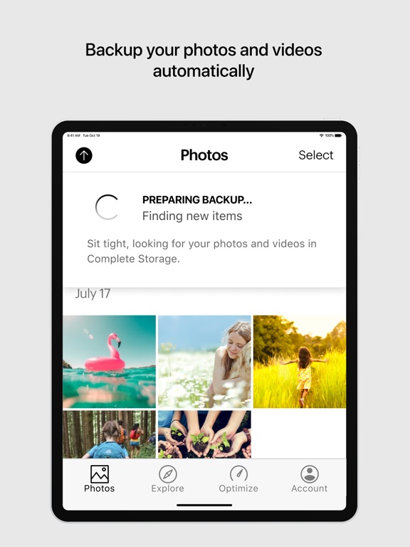 The only app with true high resolution, Complete Storage gives you unlimited* storage space to backup all your photos and videos**. Organize, sort and share photos with family and friends, and use Optimize to help you find photos you can remove to de-clutter your gallery and free up space on your device.