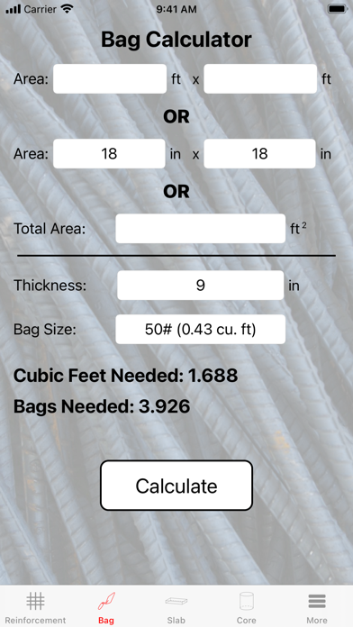 Rebar Calc is a multi function calculator allowing you to calculate the tons and linear feet of rebar, sheets of sheet mesh, and rolls of roll mesh required for a given area of concrete. Rebar Calc also allows you to configure the amount of lap necessary for your job, the size of the rebar, sheet mesh, or roll mesh.