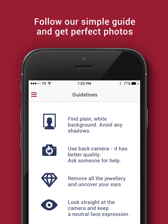 Save time, money and nerves - get your biometric ID (or passport / visa) photos using the Photo Express app.