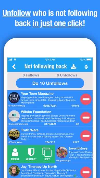 - Blacklist or whitelist users you do not want to follow or unfollow.