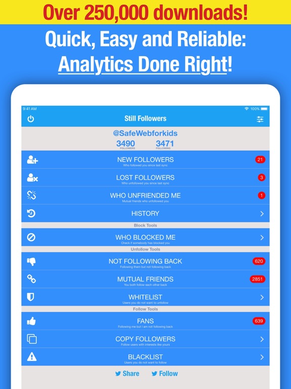Let the app find out who is not following back, your fans, your new followers, your lost followers...