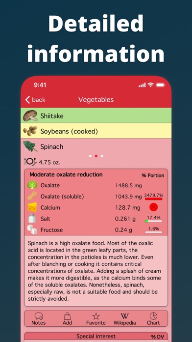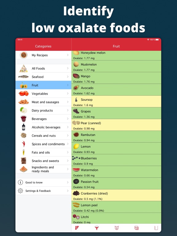 Without proper instruction a low oxalate diet is very complicated to follow. Our app knows the oxalate content of about a thousand foods and helps you plan your meals. It also considers the bioavailability of oxalates as well as other factors that play a role in renal problems like the formation of kidney stones.