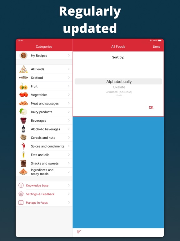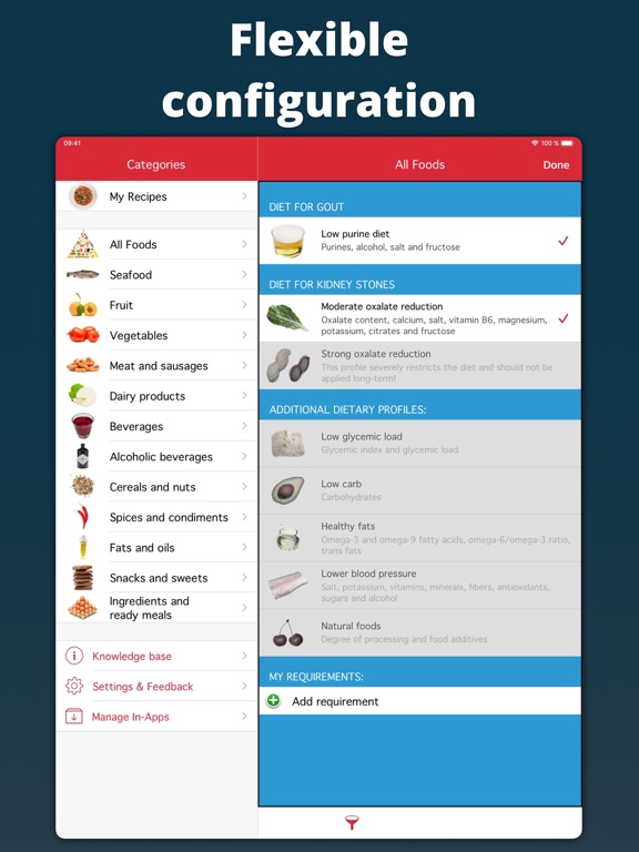 • Personalize the app with additional dietary profiles: Strong oxalate reduction, Low-salt diet for high blood pressure, Healthy fats, Low glycemic load, Low carb diet, Natural foods