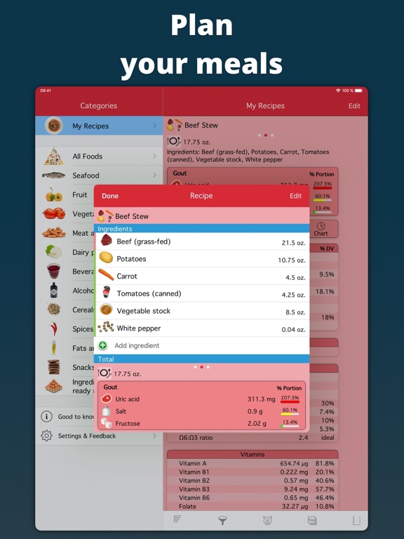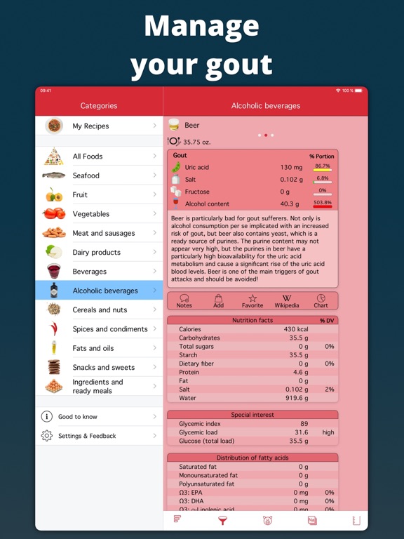Even today, the main treatment of gout still focuses too much on avoiding purines, although they are only part of the problem. Our app uses a wider approach and includes additional important factors like alcohol, fructose, and sodium. You can also combine different dietary profiles (e.g. low glycemic index) as needed.