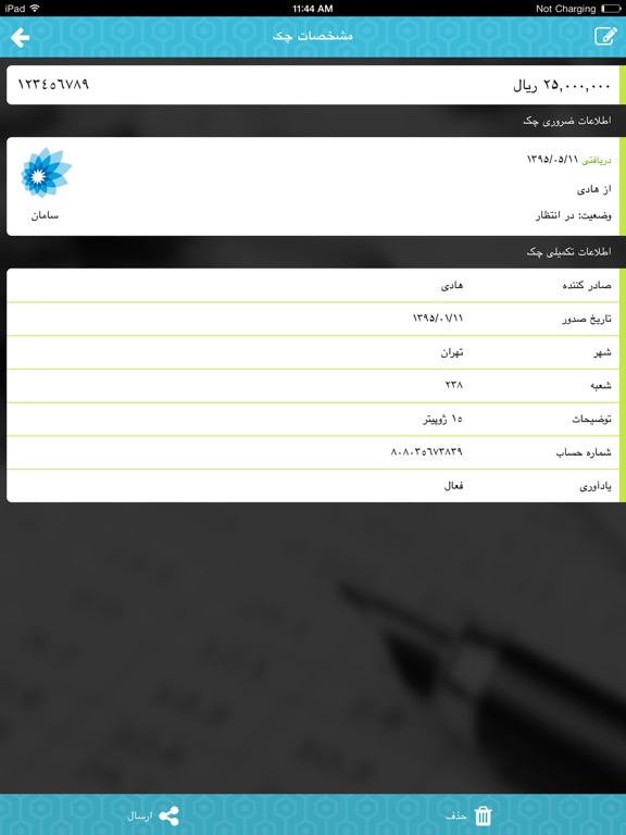 • به اشتراک گذاشتن مشخصات چک از طریق تلگرام، وایبر، واتس اپ و …