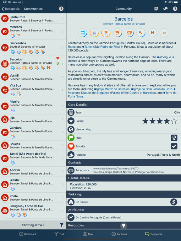 TrekRight includes an in-depth reference 'Trekopedia' (communities, albergues / hotels, attractions, services, points of interest, etc.), supports customizable routes, interactive maps (including detailed offline maps), directions and section-by-section guide, dynamic trip stats for your current section, stage, and route, an intelligent compass that shows the right direction based on your current location and chosen route, and more.