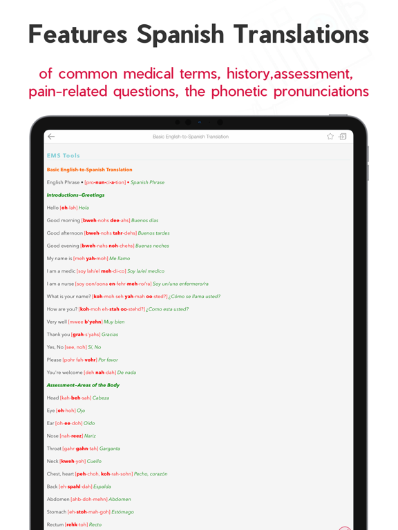 - Features Spanish translations of common medical terms, history, assessment and pain-related questions, the phonetic pronunciations, and includes questions which require ‘yes’ or ‘no’ responses
