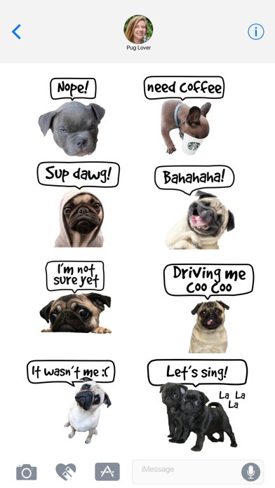 Hey there Pug lovers! Get your funny stickers here with your favorite pug shots. Post your saying in the reviews section and we will get it into our next build! • Free update pug stickers Better pugs, animated and more sayings coming soon! Be sure to look where the stickers are located on your device when your text messaging.