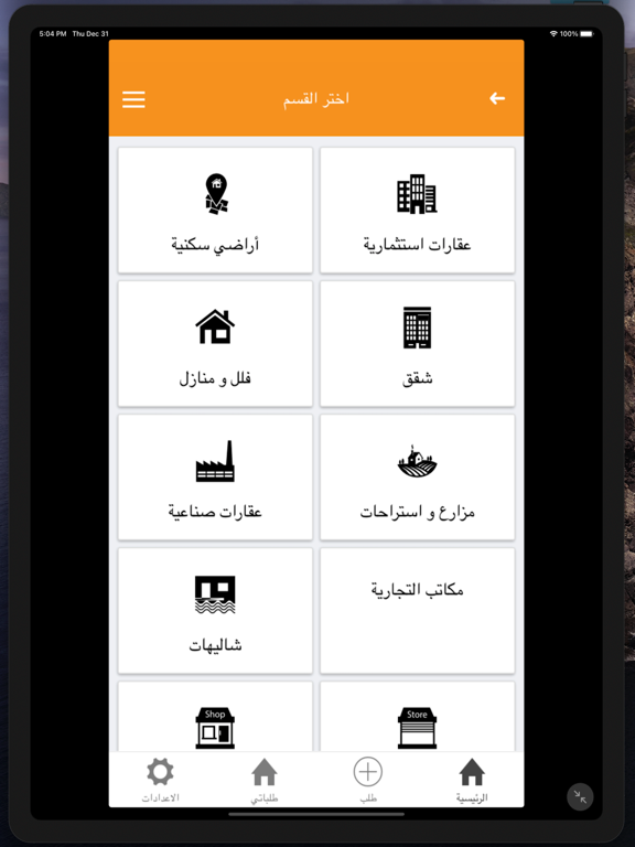 حيث أنواع مختلفة من العقارات يمكن من خلال الضغط على أي قسم منها الدخول على العقارات المعروضة لهذا القسم كما يظهر بالأسفل الأقسام الرئيسية للتطبيق كإضافة أعلان بالنسبة للمكاتب و الشركات العقارية و الاعلانات الخاصة بالمشتركين اضافة للاعدادت و هذه القائمة بالاسفل تظهر بأغلب صفحات التطبيق .