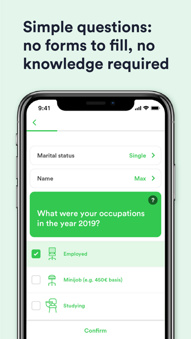 Our app collects all important info in a simple, conversational way - much like an interview. The intelligent question flow ensures that only questions that are actually relevant for your tax case are asked throughout the process.