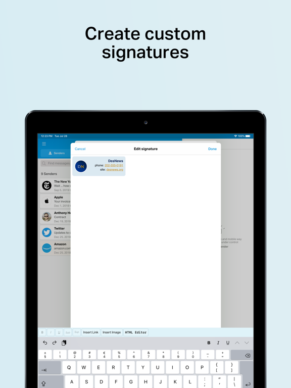 See all of your inboxes at once. Works with Gmail, Exchange IMAP, Yahoo, Hotmail/Outlook, iCloud, AOL, Google Apps, Office 365, Fastmail, and all standard IMAP accounts.