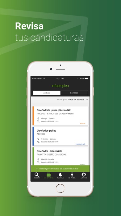 En Mis Candidaturas: puedes revisar el estado en el que te encuentras en el proceso. Las empresas te darán información si han visto tu CV, si has sido seleccionado, si has sido desestimado, si la oferta ha caducado o si ha sido eliminada.