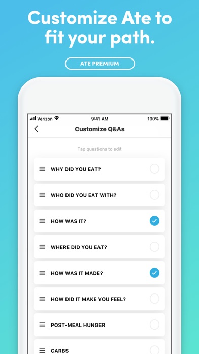 Ate’s core features are free to use and will stay free. We do offer a premium membership that will unlock features such as custom Q&As, liquid and activity tracking, the ability to share your profile via the web and to reuse your favorite photos when saving a meal. You can sign up for monthly, quarterly and yearly auto-renewing plans.