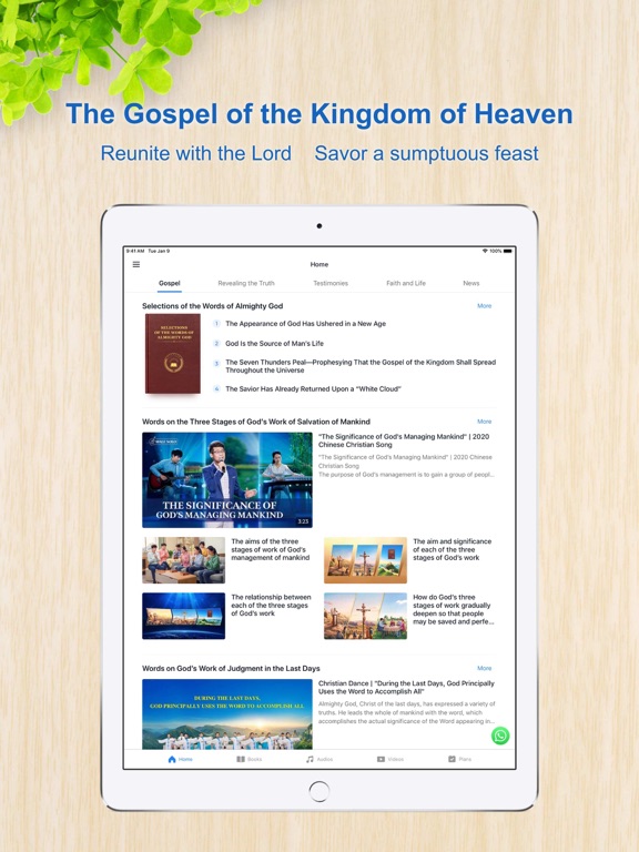 Gospel: Sections include Selections of the Words of Almighty God, The Way to Know God, and a variety of gospel truths, helping you come to know God's work of the last days.