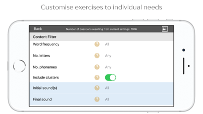 An advanced settings menu allows SLTs to tailor exercises for very specific linguistic needs. Target words can be selected according to number of phonemes (sounds), number of letters, number of syllables, first and last sounds, grammatical word class and thematic role. Results capture both accuracy and speed of responses and are displayed over time in graph form.