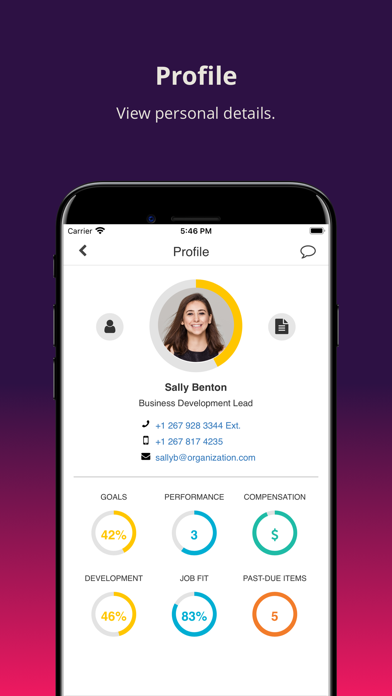 · View Complete employee profile, including metrics and details for performance, goals, compensation, learning and development