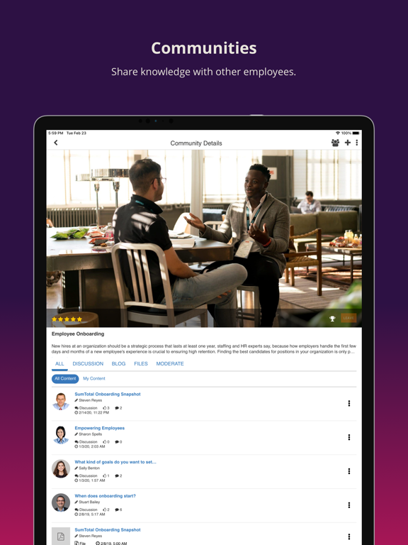 With the SumTotal Mobile App, managers and employees can learn, manage and give feedback, anywhere at any time. The app delivers an innovative experience on devices that are used every day including allowing employees to take the training they need to succeed in their current role or prepare for a new one, providing access to everything from a complete employee profile to compensation and performance details to the ability to provide continuous feedback to colleagues – increasing productivity and engagement.