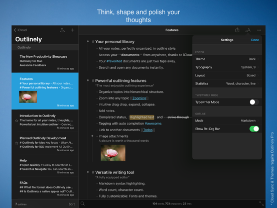 Outlinely is available for all your devices, including iPhone, iPad or Mac, so you can access all of your notes and ideas from anywhere when inspiration strikes. Outlinely uses iCloud to sync your documents seamlessly.