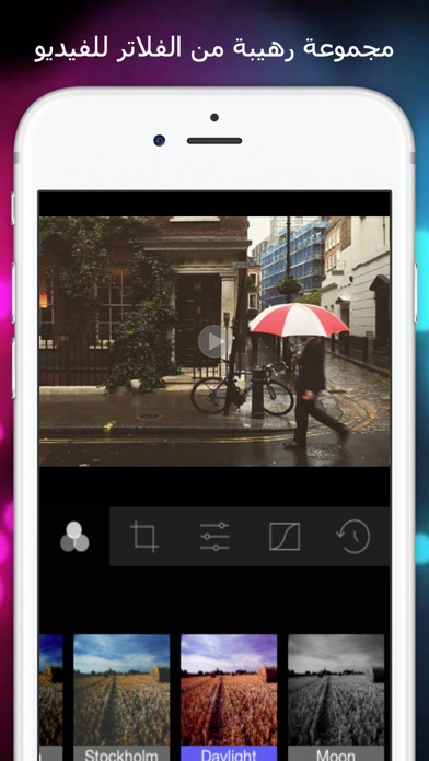 - فلاتر مذهلة فوق الفيديو : يمكنك إختيار من مجموعة مميزة من فلاتر المؤثرات على الفيديو و التي ستمكنك من تغير شكل الفيديو الى األوان بدرجات و لا اروع من الابيض و الاسود الى اجمل الالوان