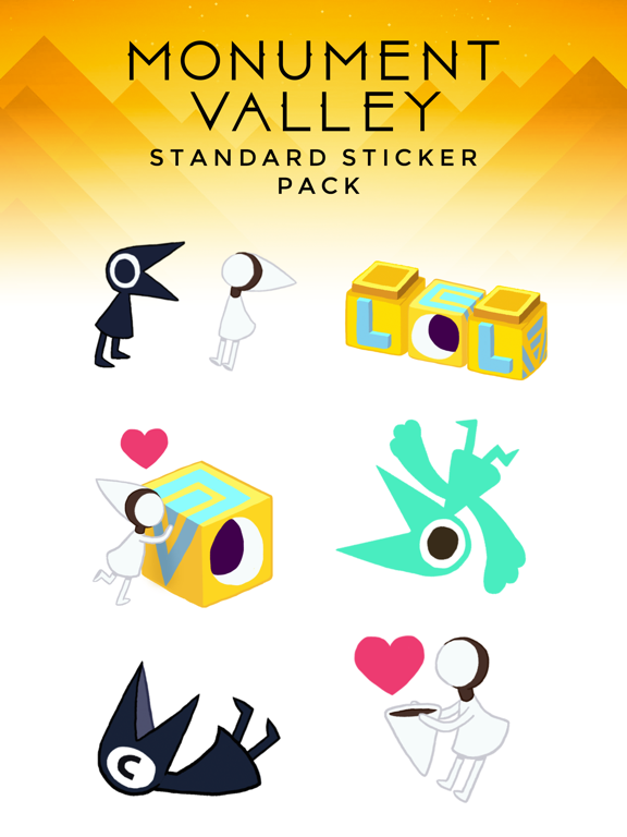 Free, fully animated stickers from the award-winning game, Monument Valley! This sticker pack contains 6 fully animated stickers featuring your favourite characters from Monument Valley, including Princess Ida and the Totem! Already have Monument Valley on your device? Update to the latest version to receive this sticker pack, plus 5 more stickers available exclusively to players!